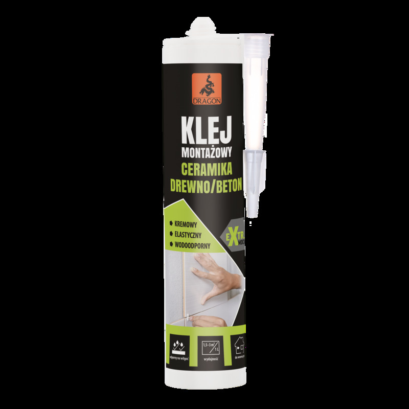 Klej montażowy marki Dragon zapewnia trwałe i solidne połączenie różnych materiałów, sprawdzając się doskonale podczas montażu płytek ceramicznych, elementów drewnianych oraz elementów betonowych.
