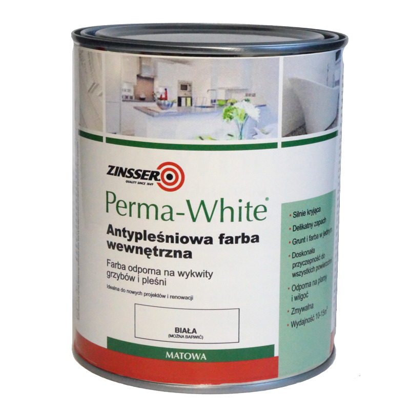 Farba chroniąca przed pleśnią PERMA WHITE 1 l Biała Matowa ZINSSER to wysokiej jakości emalia wewnętrzna, stworzona specjalnie do malowania ścian i sufitów. Jej biały kolor i matowy stopień połysku sprawiają, że doskonale komponuje się w każdym pomieszczeniu. Dzięki zastosowaniu akrylu jako typu żywicy, farba jest odporna na szorowanie oraz łatwa w czyszczeniu przy użyciu wody. Po nałożeniu dwóch warstw farby PERMA WHITE, powierzchnia jest gotowa do użytku i zyskuje piękny wygląd na długi czas.