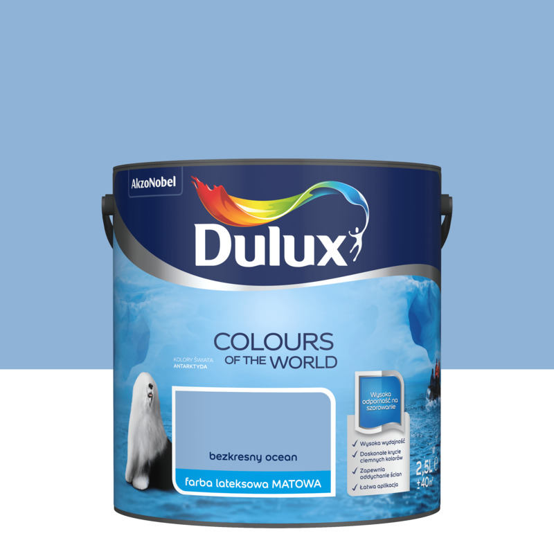 Farba Dulux Kolory świata Bezkresny ocean to idealne rozwiązanie dla osób, które cenią sobie elegancję, trwałość i wysoką jakość wykończenia. Dzięki intensywnemu kolorowi i matowemu połyskowi, Twoje wnętrze nabierze nowego charakteru. Malowanie nigdy nie było tak proste i przyjemne!