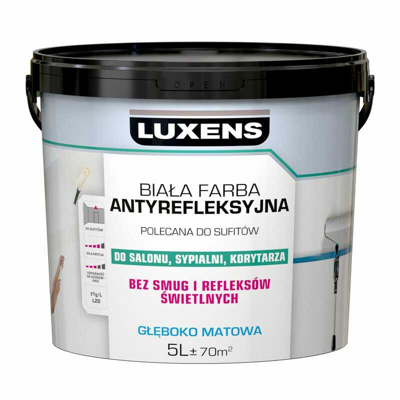 Farba Luxens Antyrefleksyjna emulsja biała 5 l to kombinacja wysokiej jakości, trwałości oraz nowoczesnego designu. Dzięki matowemu wykończeniu ściany i sufity nabiorą eleganckiego wyglądu, który będzie pasował do każdego stylu aranżacji wnętrz.