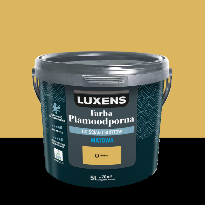 Farba Luxens Plamoodporna Ginger łączy w sobie doskonałe właściwości farby wewnętrznej z pięknym, złotym odcieniem. Dzięki wysokiej wydajności 8 m²/l oraz szybkiemu schnięciu w dotyku po zaledwie 2 godzinach od malowania, zadanie pomalowania ścian staje się łatwe i przyjemne. Długotrwała ochrona przed codziennym użytkowaniem oraz łatwość w utrzymaniu czystości sprawiają, że farba Luxens jest doskonałym wyborem dla osób ceniących wysoką jakość i trwałość.