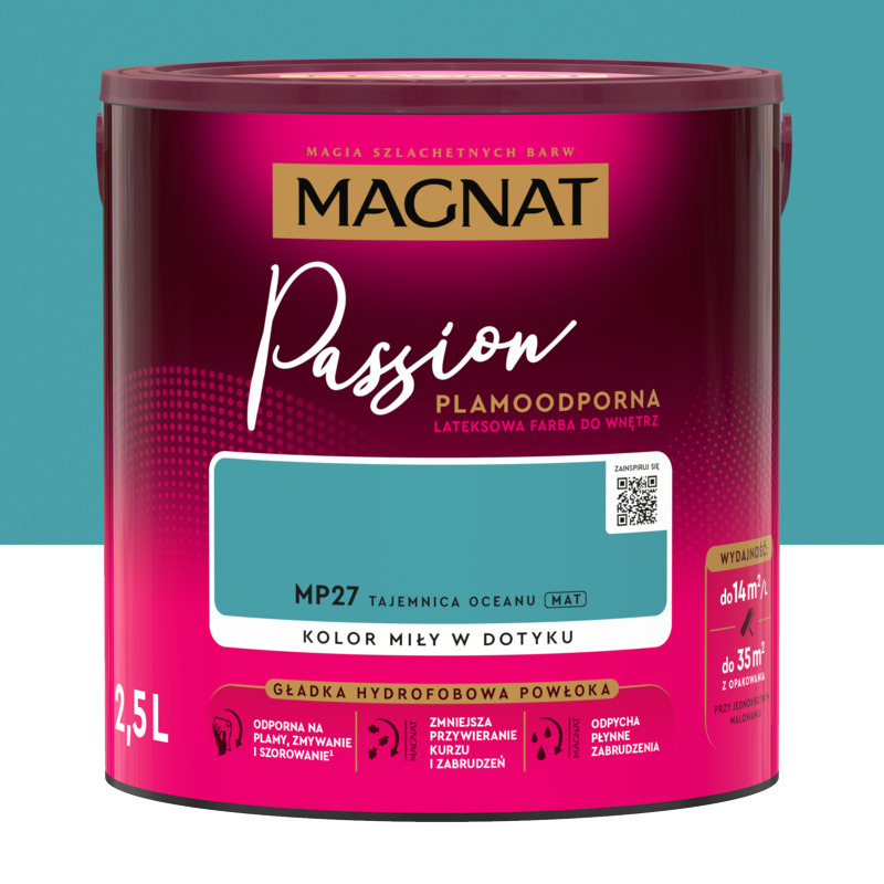 Farba Magnat Passion Tajemnica oceanu to nie tylko intensywny kolor i matowy połysk, ale także trwała ochrona Twoich ścian. Dzięki najwyższej jakości składnikom, farba gwarantuje długotrwałe i estetyczne efekty malowania. Wybierz produkt, który zapewni Ci nie tylko piękne wnętrze, ale także spokój i komfort na wiele lat.