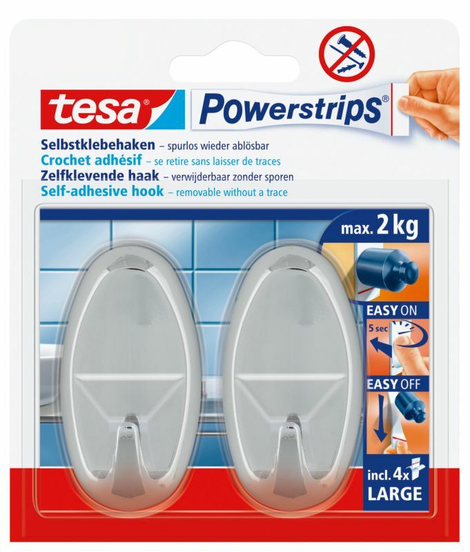 Łatwy montaż, bez użycia wiertarki, śrub czy gwoździ, Wytrzymują obciążenie do 2 kg, Usuwanie bez pozostawiania śladów dzięki unikalnej technologii Tesa Powerstrips®, Wykonane z wysokiej jakości tworzywa sztucznego, Można je mocować do płytek ceramicznych, szkła, drewna, plastiku i wielu innych powierzchni, Haczyki można wykorzystać ponownie z pomocą dużych plastrów samoprzylepnych Tesa Powerstrips®, Haczyki całkowicie zakrywają plastry Tesa Powerstrips®, Nie nadają się do przyklejania na styropian, materiały piankowe, powierzchnie z powłoką zapobiegającą przywieraniu, materiały porowate