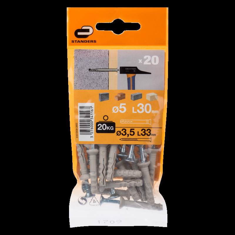 Kołek do szybkiego montażu 5 x 30 mm 20 szt. Standers to niezawodny produkt, który z pewnością ułatwi każdą pracę budowlaną. Dzięki solidnej konstrukcji, łatwej aplikacji oraz wysokiej wytrzymałości, jest idealnym rozwiązaniem do montażu w cegle i innych trudnych materiałach. Niezastąpiony dla każdego majsterkowicza, zapewni trwałe i bezpieczne mocowanie nawet przy dużym obciążeniu. Marka Standers gwarantuje wysoką jakość i długotrwałość produktu, co pozwoli cieszyć się efektywnym i bezpiecznym wykonaniem każdej pracy budowlanej.