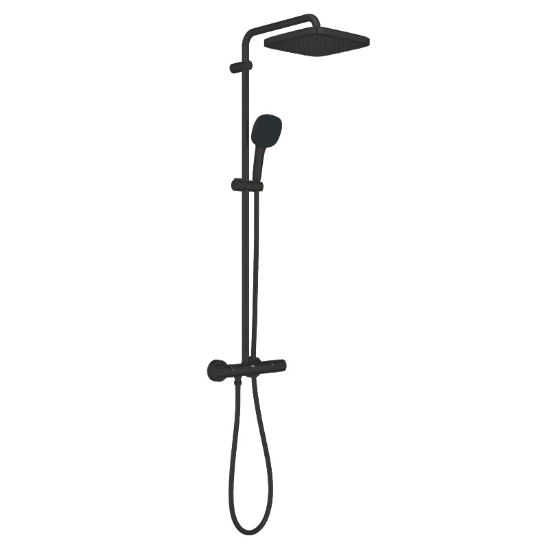 Z systemem prysznicowym GROHE Vitalio Comfort 250, Twoja łazienka może być bardziej funkcjonalna i komfortowa niż myślisz! Jego "sercem" jest bateria termostatyczna wyposażona w głowicę GROHE TurboStat, która utrzymuje wybraną temperaturę przepływu pomimo skoków ciśnienia w instalacji. Teraz możesz bez przeszkód cieszyć się relaksującą kapielą, a żeby dodatkowo poprawić bezpieczeństwo obsługi, wykorzystano blokadę SafeStop, która zapobiega przypadkowemu włączeniu zbyt gorącej wody. System oferuje wybór między jednostrumieniową deszczownicą o wymiarach 25x25 cm lub słuchawką prysznicową z 2 strumieniami - delikatnym Rain oraz orzeźwiającym Jet. Obydwa natryski wyposażono w technologię GROHE DreamSpray, która gwatrantuje równy, pełny przepływ wody, a dzięki systemowi SpeedClean, nie musisz martwić się osadzającym się w dyszach kamieniem - wystarczy przetarcie ręką, by pozbyć się go na dobre! Wszystkie elementy zestawu GROHE Vitalio Comfort 250 zachwycają także matowym, czarnym wykończeniem, które od razu przyciąga wzrok i będzie się znakomicie prezentować w nowoczesnych aranżacjach.