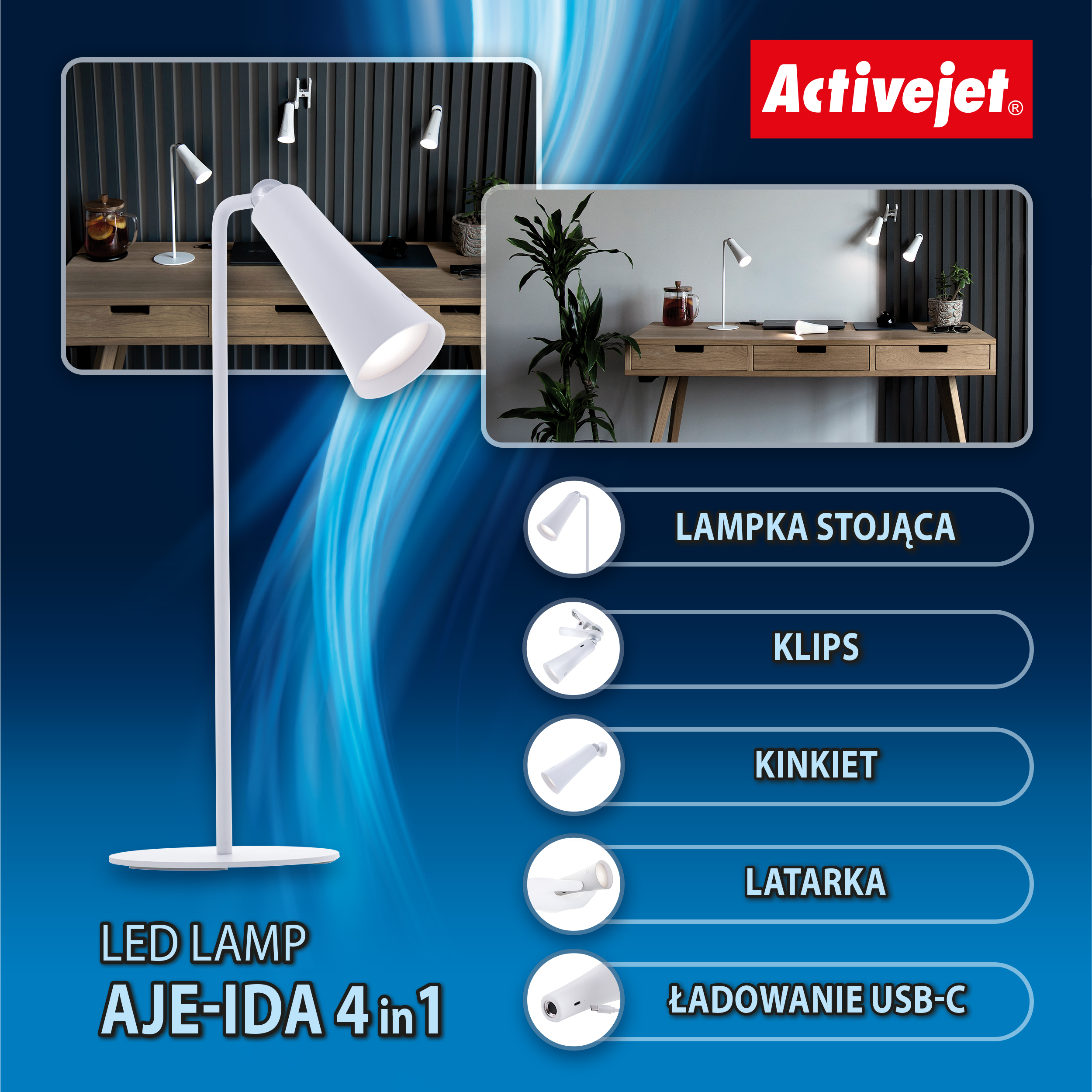 Lampka wielofunkcyjna LED Activejet AJE-IDA 4in1 to doskonały wybór dla osób ceniących wysoką jakość i design. Dzięki możliwości regulacji jasności i koloru światła, stworzysz idealne warunki do pracy, czytania czy relaksu.