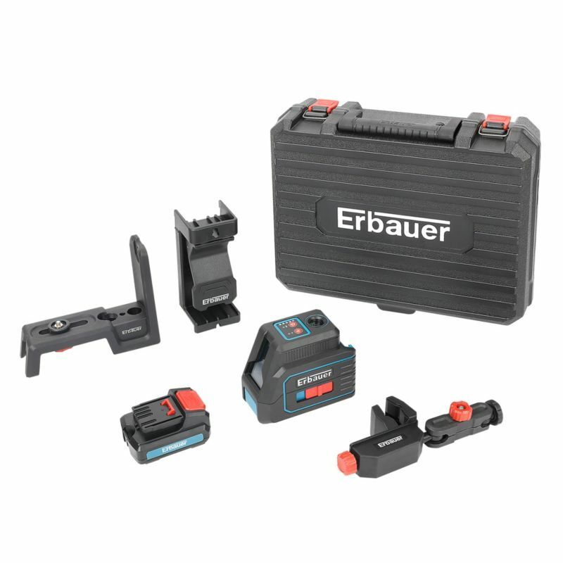 Jakość produktu potwierdzona 5-letnią gwarancją., Czerwony laser klasy 2 o zasięgu 20 m., Zgodność z akumulatorami Erbauer Ext 12V (sprzedawane osobno; W zestawie adapter w kształcie akumulatora Ext 12V na 4 baterie AA)., Funkcja punktów pionu kieruje wiązkę lasera bezpośrednio w górę i w dół. Umożliwia łatwy pomiar odległości na podłodze, a następnie wykonanie oznaczeń na suficie (idealne rozwiązanie w przypadku oczek sufitowych)., Funkcja samopoziomowania, jeśli początkowe ustawienie mieści się w zakresie 4°. Jeśli wartość progowa jest przekroczona, lasery wyraźnie sygnalizują to miganiem., Laser poziomy 360° umożliwia wyznaczenie linii w obrębie całego pomieszczenia., Możliwość przytwierdzenia do powierzchni z wykorzystaniem otworu na zaczep, magnesu lub gniazda z gwintem M6 (do statywu)., Wysoka dokładność rzędu 0,3 mm/m.