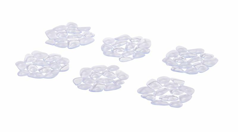 Dzięki matom łazienkowym mini GoodHome Koros 6 szt. Twój mały azyl stanie się miejscem pełnym spokoju i piękna. Przezroczysty kolor mat oraz ich subtelny design sprawiają, że idealnie komponują się z każdym wystrojem łazienki, tworząc harmonijną przestrzeń do relaksu i regeneracji.