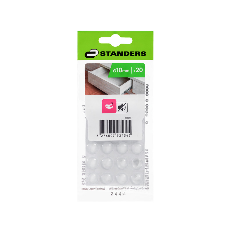 Odbojnik samoprzylepny do mebli 10 mm 20 szt. Standers to doskonałe rozwiązanie, które umożliwia ochronę mebli przed uszkodzeniami podczas codziennego użytkowania. Dzięki wysokiej jakości materiałom, takim jak polichlorek winylu (PVC), te podkładki amortyzujące są trwałe i skuteczne. Ich okrągły kształt oraz bezbarwny wygląd sprawiają, że idealnie pasują do każdego rodzaju mebli. W opakowaniu znajduje się 20 sztuk, co wystarcza do zabezpieczenia większej ilości mebli w domu czy biurze.