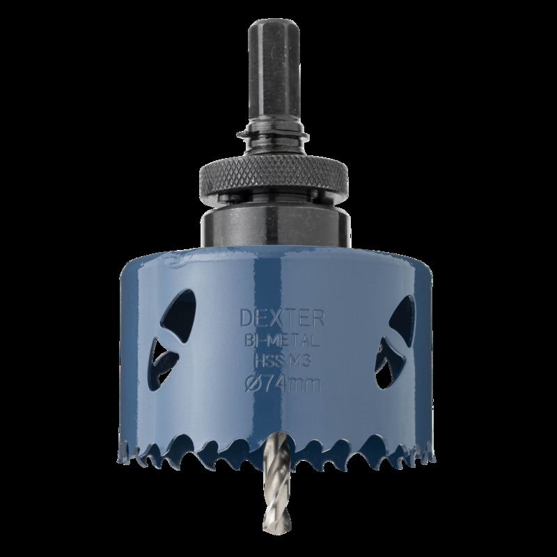 Otwornica do metalu HSS 74 mm + wiertło centrujące i trzpień DEXTER