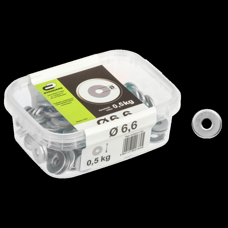 Podkładka 6.6 0.5 kg Standers to doskonały produkt, który świetnie sprawdzi się w codziennym użytkowaniu. Wykonana z wysokiej jakości stali nierdzewnej, gwarantuje trwałość i niezawodność. Jej płaska szeroka konstrukcja oraz średnica wewnętrzna wynosząca 6.6 mm sprawiają, że idealnie nadaje się do stabilnego ułożenia przedmiotów. Dodatkowo, ocynkowane wykończenie produktu zapewnia ochronę przed rdzą i korozją. Podkładka jest zapakowana w opakowaniu zawierającym 17 sztuk, co sprawia, że jest idealna zarówno do użytku domowego, jak i profesjonalnego.