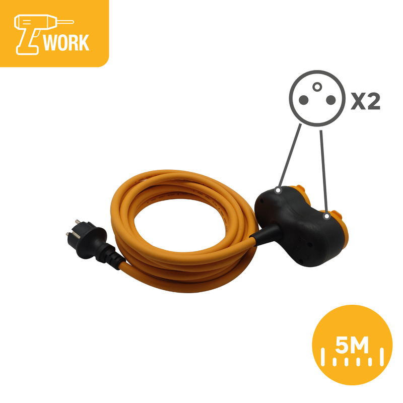 Podłącz urządzenia robocze (wiertarkę, szlifierkę) do gniazdka. Przedłużacz z 2 gniazdami do zasilania 2 urządzeń elektrycznych. Odporny na drobne zanieczyszczenia i zachlapania wodą (IP44). Zwiększone bezpieczeństwo dzięki ochronnym klapkom na gniazdach. Przedłużacz jest żółty, dzięki czemu jest łatwy do zlokalizowania, na przykład w warunkach zapylenia. Podczas korzystania z narzędzi o dużej mocy pamiętaj o rozwinięciu przedłużacza. Długość kabla: 5M. Natężenie prądu 16A. 5-letnia gwarancja