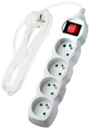 Przedłużacz 4-gniazdowy z uziemieniem. Wyłącznik zasilania. Napięcie znamionowe: AC 230 V ~ 50 Hz. Maksymalne obciążenie: 10 A (2300 W). Długość przewodu: 5 m. Rodzaj przewodu: H05VV-F 3G1mm2. Kolor biały.