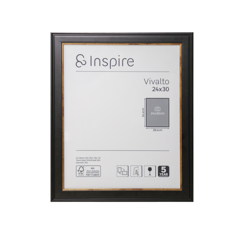 Rama na zdjęcie Vivalto 24 x 30 cm czarno-złota Inspire to elegancka i stylowa ramka, idealna do wyeksponowania ulubionego zdjęcia. Wykonana z wysokiej jakości polistyrenu (PS) w kolorze czarnym, posiada delikatny matowy połysk, który dodaje jej wyjątkowego charakteru. Front został wykonany ze szkła, natomiast tył z paneli drewnopochodnych. Dzięki uniwersalnym wymiarom 24 x 30 cm, rama doskonale komponuje się z różnorodnymi zdjęciami, dodając im elegancji i stylu.