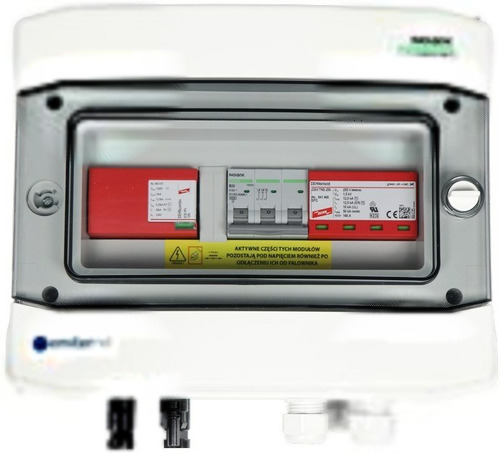 Rozdzielnica przył. DCAC hermetyczna EMITER z ogranicznikiem przepięć DC Dehn 1000V typu 1+2, 1 x łańcuch PV, 1 x MPPT // ogr. AC typ 1+2, 20A 3-F1x łańcuch modułów na 1 MPPT1x ogranicznik przepięć DC Dehn typ 1+21x ogranicznik przepięć AC Dehn typ 1+21x wyłącznik nadprądowy 3-fazowy 20AGotowa do podłączeniaWyprowadzone złącza MC4Stopień ochrony IP65