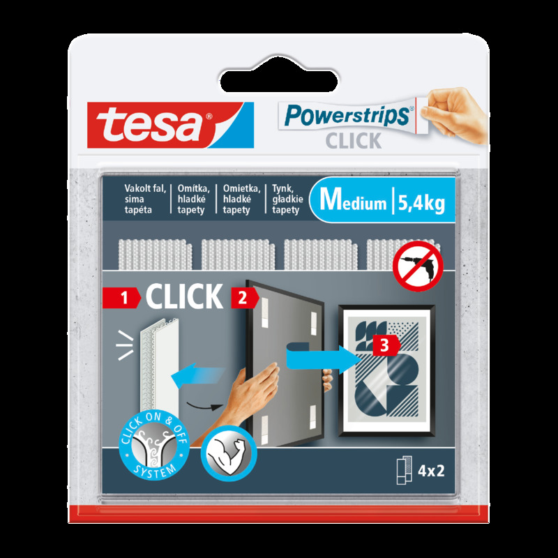 Rzepy Powerstrips Click wykorzystują sprawdzoną technologię Powerstrips, która umożliwia zawieszenie ramek do zdjęć lub innych płaskich przedmiotów bez konieczności wiercenia. Słyszalne kliknięcie informuje użytkownika, że przedmiot został prawidłowo zamocowany. Technologia Powerstrips umożliwia usunięcie rzepu bez pozostawienia śladu. Łatwe mocowanie do większości powierzchni: tynku, gładkich tapet, metalu, płytek i najczęściej spotykanych tworzyw sztucznych.