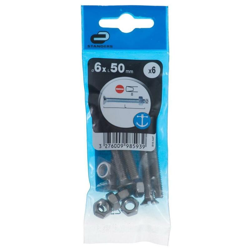 Śruba 6 x 50 mm 6 szt. Standers to doskonały produkt do wszelkiego rodzaju prac montażowych. Wykonana ze stali śruba o średnicy 6 mm i długości 50 mm gwarantuje trwałość i solidność. Łeb stożkowy oraz płaski oraz płaskie nacięcie we łbie ułatwiają montaż i zapewniają pewne połączenie.