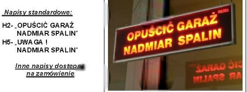 Tablica ostrzegawcza dwustronna "OPUŚCIĆ GARAŻ NADMIAR SPALIN", podświetlenie czerwone LED, wbudowana syrenka dwutonowa, zasilanie 230V