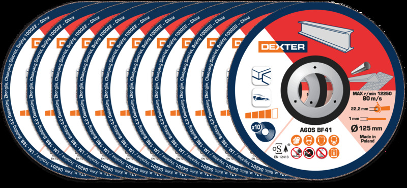 Tarcze do cięcia 125 x 1 x 22.23 STAL/INOX 10 szt. DEXTER to doskonałe narzędzie do precyzyjnego i skutecznego cięcia stali nierdzewnej. Dzięki wysokiej jakości korundowej tarczy, można szybko i precyzyjnie przeciąć materiał, zachowując przy tym jego integralność. Tarcza idealnie nadaje się do pracy z szlifierką kątową, zapewniając stabilne mocowanie oraz trwałość.