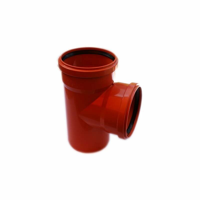 Pomarańczowy kolor trójnika kanalizacji wyróżnia go spośród innych elementów instalacji. Kąt 90° ułatwia precyzyjne ułożenie rur, co sprawia, że montaż jest prosty i szybki. Produkt idealnie pasuje do zewnętrznych systemów odprowadzania nieczystości.