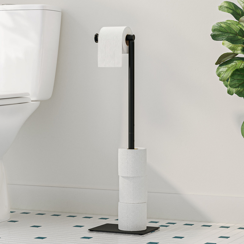 Stojak na papier toaletowy z opcją przechowywania zapasu to praktyczna propozycja dla tych, którzy lubią mieć wszystko pod kontrolą. Stojak wykonany jest z wysokiej jakości stali nierdzewnej w kolorze klasycznej czerni dzięki czemu jest trwałym i stylowym wyposażeniem nowoczesnej łazienki. Stojak ma 62 cm wysokości i stabilną kwadratową podstawę. Mieści na sobie około 5 rolek dzięki czemu w Twojej toalecie nigdy nie zabraknie papieru.