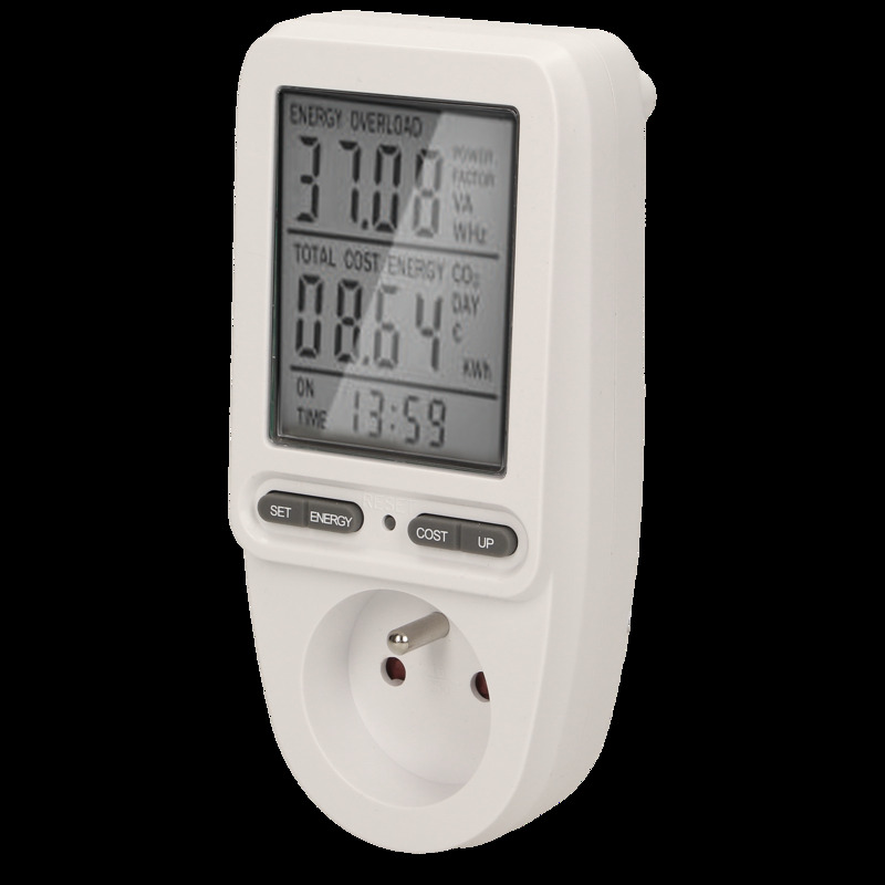 Watomierz umożliwia nam sprawdzenie zużycia prądu elektrycznego i obliczenie kosztów zużytej energii podłączonego urządzenia. Duży wyświetlacz LCD pokazuje dodatkowo: napięcie sieci, prąd w obwodzie, częstotliwość prądu, współczynnik mocy POWER FACTOR, moc podłączonego obciążenia, całkowite zużycie energii kWh, koszt zużytej energii, programowalną cenę 1kWh, łączny czas pomiaru zużycia energii od 0 sek. do 9999 dni, uśrednioną wagę emisji CO2 przy wytworzeniu energii pobranej. Pomiar napięcia: 150V~ 276V~.