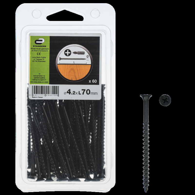 Wkręt do płyt G-K 4.2 x 70 mm 60 szt. Standers to gwarancja solidności i trwałości. Dzięki najlepszej jakości stali oraz starannej obróbce, ten wkręt zapewni Ci niezawodne połączenia na długie lata.