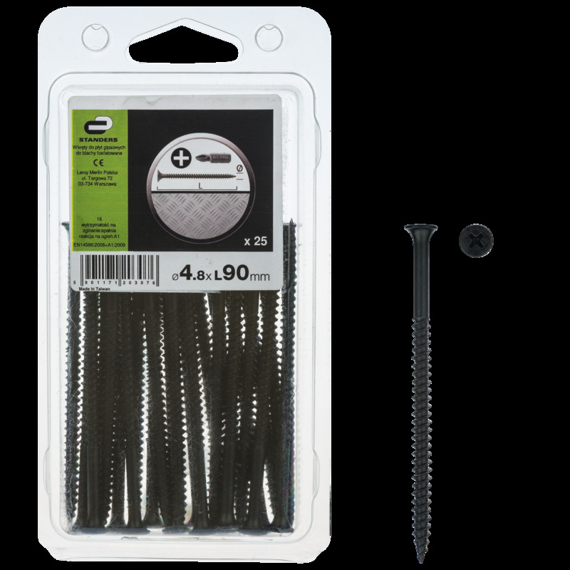 Wkręt do płyt G-K 4.8 x 90 mm 25 szt. Standers to produkt, który cechuje trwałość i solidność. Specjalnie zaprojektowany do mocowania płyt gipsowo-kartonowych na dachu, gwarantuje pewne połączenie przez wiele lat.