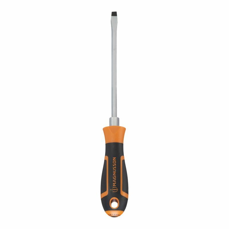 Wkrętak płaski Magnusson 150 x 6,5 mm to niezastąpione narzędzie dla każdego majsterkowicza. Dzięki wysokiej jakości materiałom wykonania oraz ergonomicznie zaprojektowanemu uchwytowi, prace warsztatowe staną się przyjemnością. Jego wytrzymały i trwały grot gwarantuje precyzyjne wkręcanie śrub nawet w najbardziej trudno dostępnych miejscach. Bezpieczne i komfortowe użycie wkrętaka jest zapewnione dzięki antypoślizgowej rączce, która doskonale leży w dłoni.