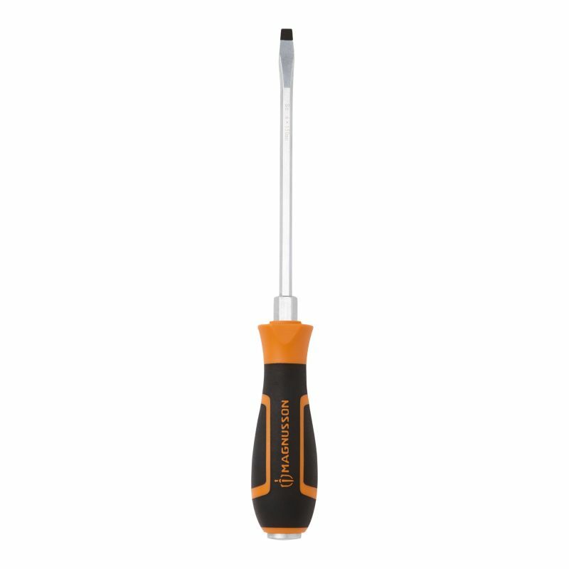 Wkrętak płaski Magnusson to niezastąpione narzędzie podczas wszelkiego rodzaju prac warsztatowych i majsterkowania. Dzięki solidnemu wykonaniu oraz ergonomicznemu uchwytowi zapewnia komfortową pracę nawet podczas długotrwałego użytkowania. Grot wkrętaka wykonany z wytrzymałej i trwałej stali chromowo-wanadowo-molibdenowej (S2) doskonale sprawdza się w ciężkich warunkach pracy, gwarantując precyzyjne i skuteczne wkręcanie śrub i wkrętów.