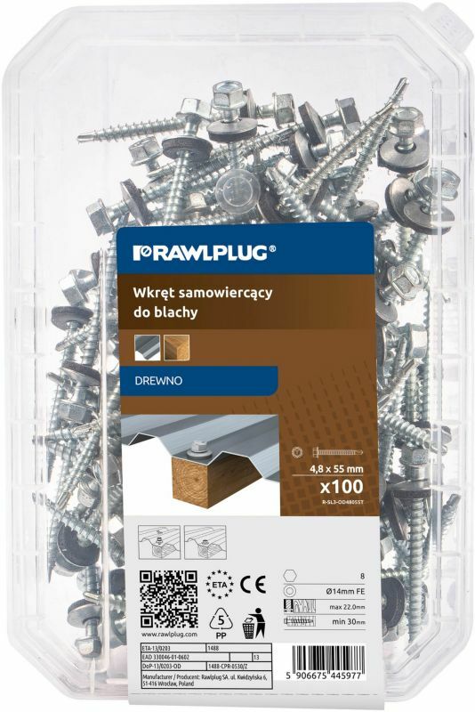 Wkręty samowiercące Rawlplug 4,8 x 55 mm ocynkowane 100 szt. znajdą zastosowanie podczas montażu blachy do drewnianej podstawy. Dzięki specjalnej konstrukcji elementu prace wykonasz sprawnie. Ostre zakończenie zapobiega przesuwaniu się wkrętu po materiale. Dzięki specjalnemu kształtowi podkładki wykonane łączenie będzie miało optymalną szczelność. Uszczelniająca podkładka charakteryzuje się odpornością na promienie UV oraz różnicę temperatur. Wkręty samowiercące Rawlplug ocynkowane zostały wykonane ze stali. Produkt zabezpieczono warstwą ocynku, dzięki czemu wkręty są odporne na korozję. W naszym asortymencie dostępne są również rozmaite warianty kolorystyczne wkrętów marki Rawlplug, na przykład ceglaste i zielone.
