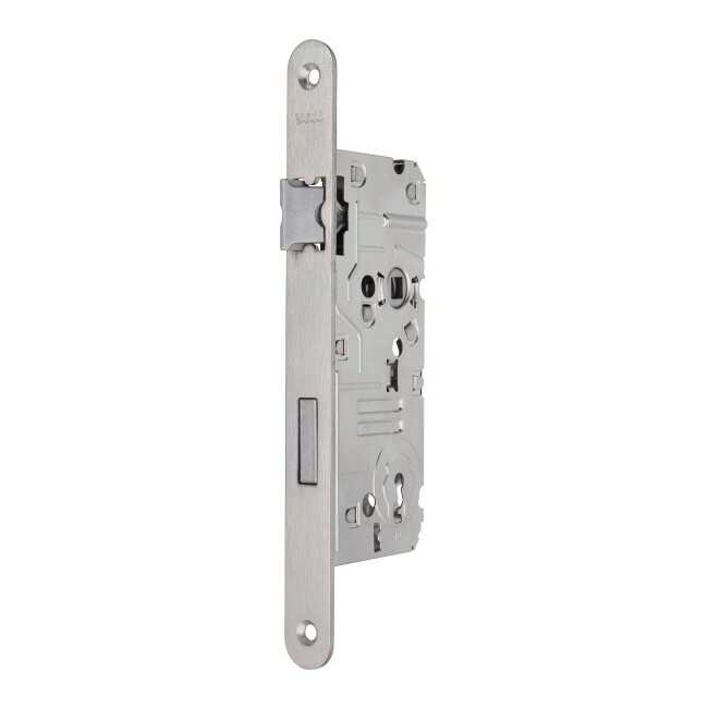 Kasetka z zamkiem wpuszczanym 72/50 WC lewy LOB ma szerokość 67 mm, grubość 14 mm i wysokość 147 mm, co sprawia, że jest idealnym rozwiązaniem do drzwi łazienkowych. Listwa czołowa o szerokości 20 mm i wysokości 220 mm z okrągłymi końcami nadaje mu elegancki wygląd. Zamek ten jest solidny i funkcjonalny, gwarantując nie tylko bezpieczeństwo, ale również wygodę użytkowania. Doskonale sprawdzi się w każdym domu lub mieszkaniu.