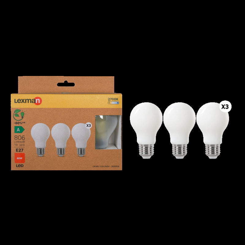 Zestaw 3 białych żarówek LED o średnicy 60 mm z dużą gwintowaną podstawą (E27). Żarówki te charakteryzują się ciepłym białym współczynnikiem oddawania barw (2700 K) i zużywają o 60% mniej energii niż żarówka o mocy 9,4 W w klasie energetycznej F, dzięki klasie energetycznej A. Żarówki te mają moc wyjściową 806 lumenów, co odpowiada 60 watów, ale zużywają tylko 3,8 wata. Produkt objęty jest 5-letnią gwarancją