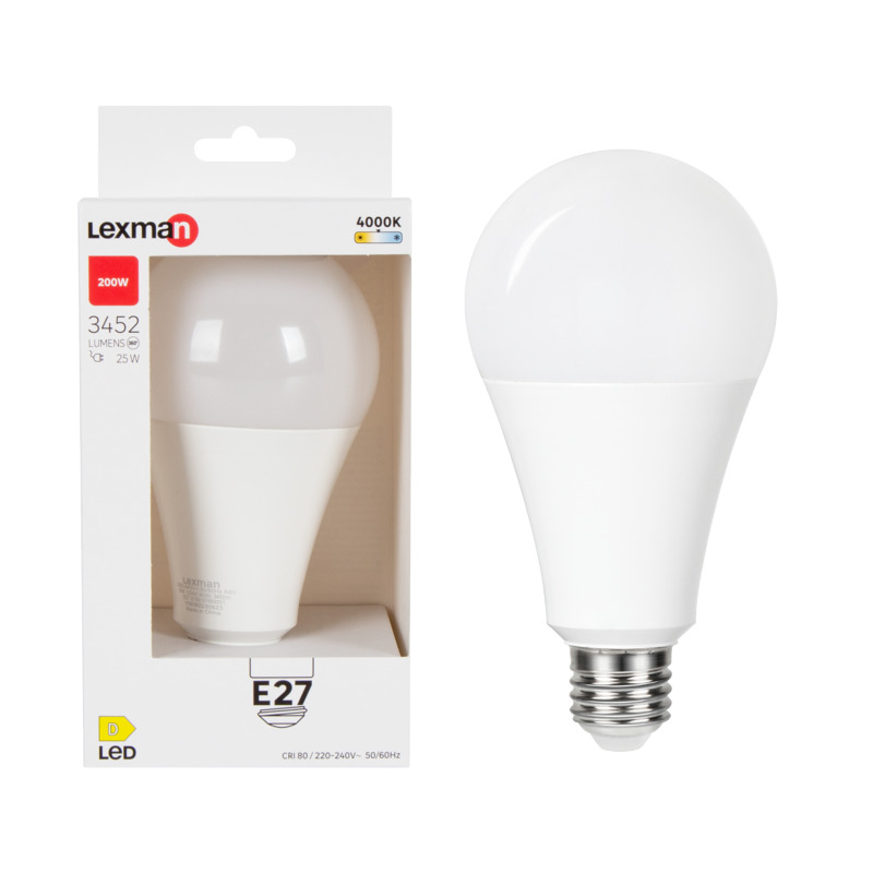 Żarówka LED E27 24 W 3452 lm Neutralna biel Lexman to produkt, który spełni oczekiwania najbardziej wymagających klientów. Dzięki rodzinie kolorów białego oraz neutralnej barwie światła, stworzy przyjemną atmosferę w Twoim domu. Waga netto wynosząca 0.142 kg sprawia, że produkt jest lekki i łatwy w montażu. Produkt nie wymaga korzystania z żadnej aplikacji ani pilota do obsługi, co sprawia, że jego użytkowanie jest proste i intuicyjne. Dodatkowo, opakowanie zawiera wszystkie niezbędne informacje dotyczące produktu, dzięki czemu możesz być pewny, że dokonałeś właściwego wyboru.
