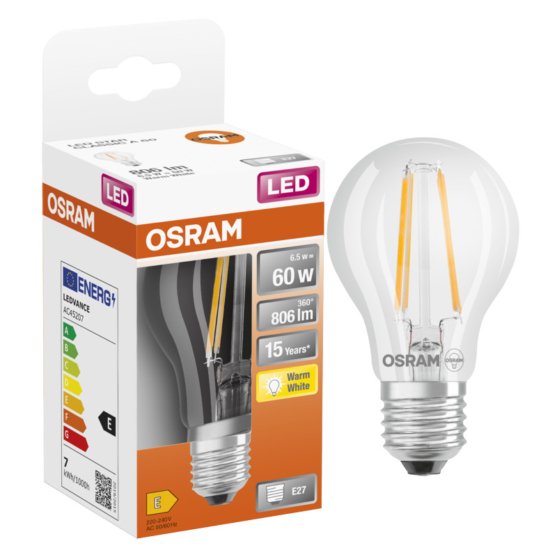Osram Żarówka LED STAR CLASSIC A60 filament 7W E27 806 lm 2700K to źródło światła, które doskonale pasuje do każdego wystroju. Dzięki uniwersalnemu kształtowi i nowoczesnemu designowi, sprawdzi się w każdym pomieszczeniu, zarówno w domu, jak i biurze.