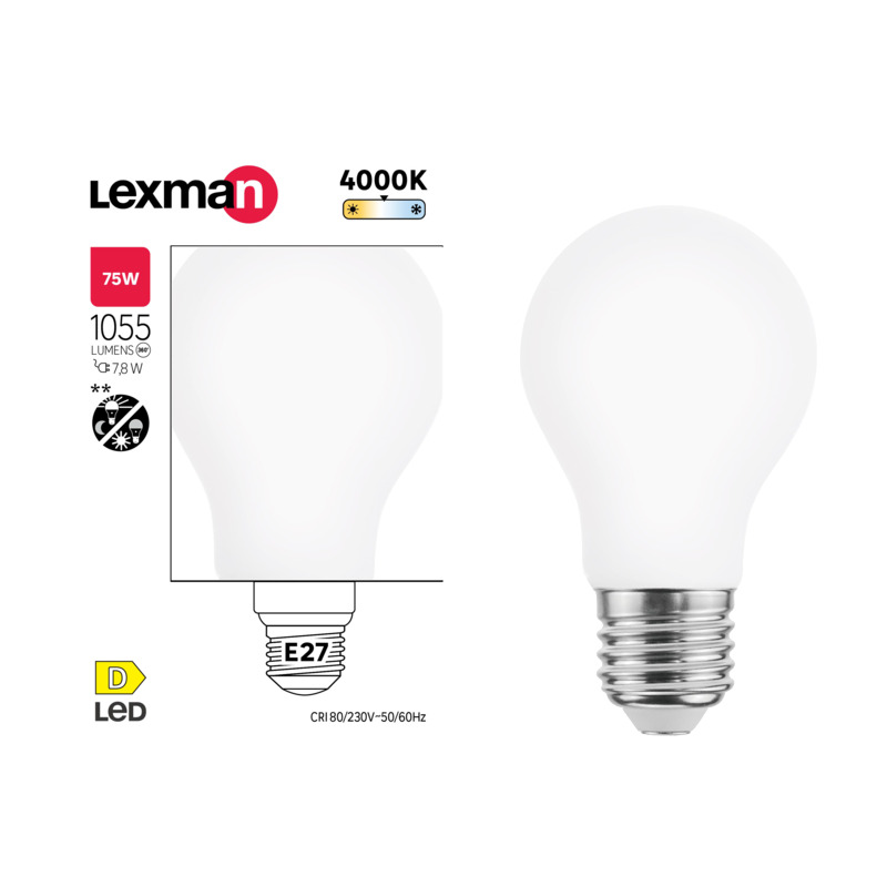 Żarówka LED E27 7,8 W 1055 lm Neutralna biel Lexman to energooszczędny produkt o wysokiej jakości światła. Dzięki nowoczesnej technologii LED zapewniający jasne oświetlenie. Idealny do stosowania w domu, biurze, sklepie czy restauracji. Dzięki neutralnej barwie światła stworzy przyjemną atmosferę w każdym pomieszczeniu.