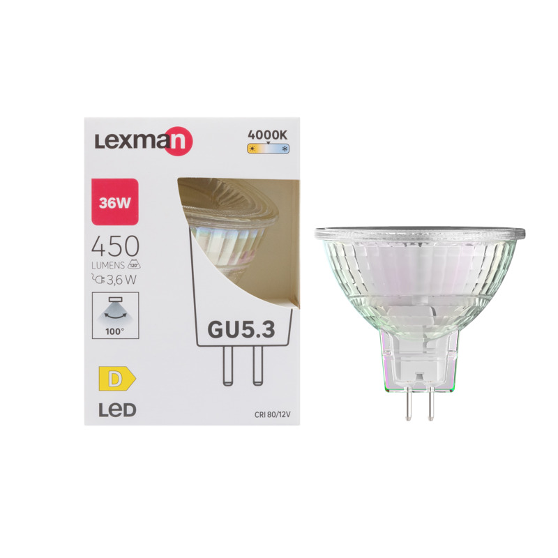 Dzięki żarówce LED GU5.3 3,6 W 450 lm Neutralna biel Lexman możesz stworzyć doskonałe oświetlenie w każdym pomieszczeniu, bez obaw o nadmierne zużycie energii.