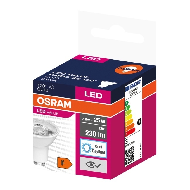 Żarówka LED GU10 230 lm 6500 K 120° pomoże Ci rozjaśnić mrok w pomieszczeniach mieszkalnych, biurowych czy użyteczności publicznej. Możesz zamontować ją także na zewnątrz budynku, lecz wówczas lampa, w której umieścisz żarówkę, musi mieć szczelność co najmniej na poziomie IP65. Produkt ma postać reflektora o bagnetowym mocowaniu. Na końcu gwintu znajdują się dwa piny, które dzieli odległość dziesięciu milimetrów. Montaż reflektora jest bardzo łatwy. Żarówka LED jest źródłem światła o zimnej, białej barwie. Produkt wyróżnia się niskim zużyciem energii. Dzięki temu może pomóc Ci obniżyć wysokość opłat za pobór prądu. Żarówka jest częścią kolekcji LED Value. W naszej ofercie znajdziesz także inne produkty z tej serii.