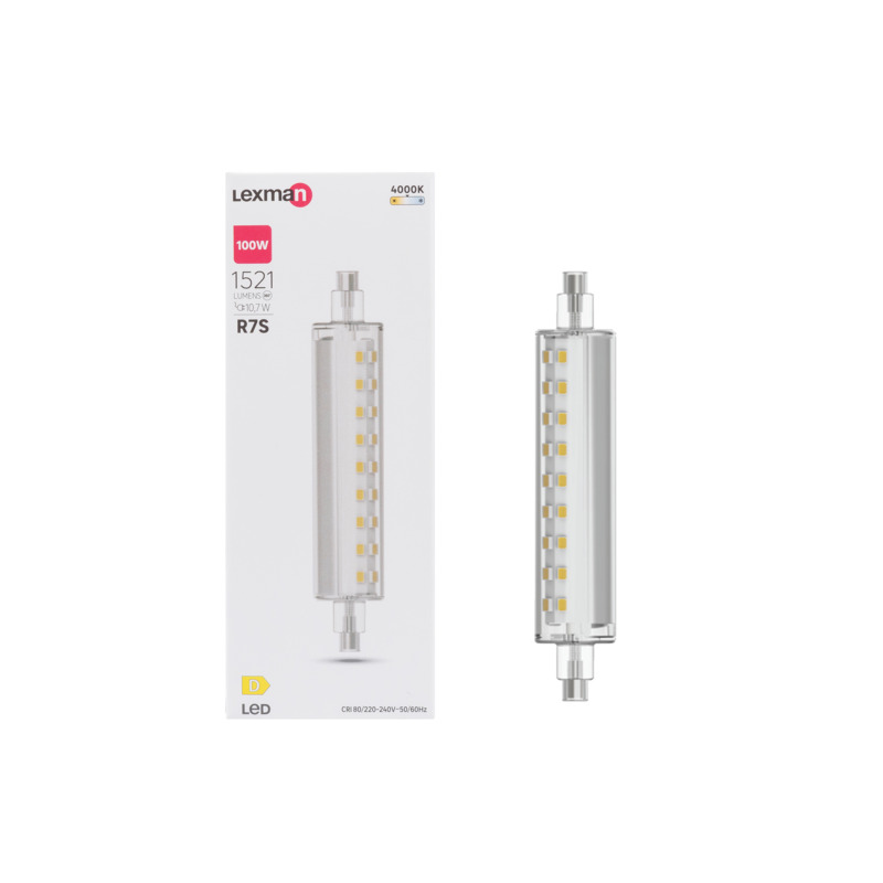 Dzięki materiałowi poliwęglan (PC) oraz wykończeniu szkła żarówka LED R7S 10,7 W 1521 lm Neutralna biel Lexman cechuje się nie tylko trwałością, ale również elegancją. Jej nowoczesny wygląd sprawi, że światło stanie się nie tylko funkcjonalnym elementem, ale także designerską ozdobą pomieszczenia.