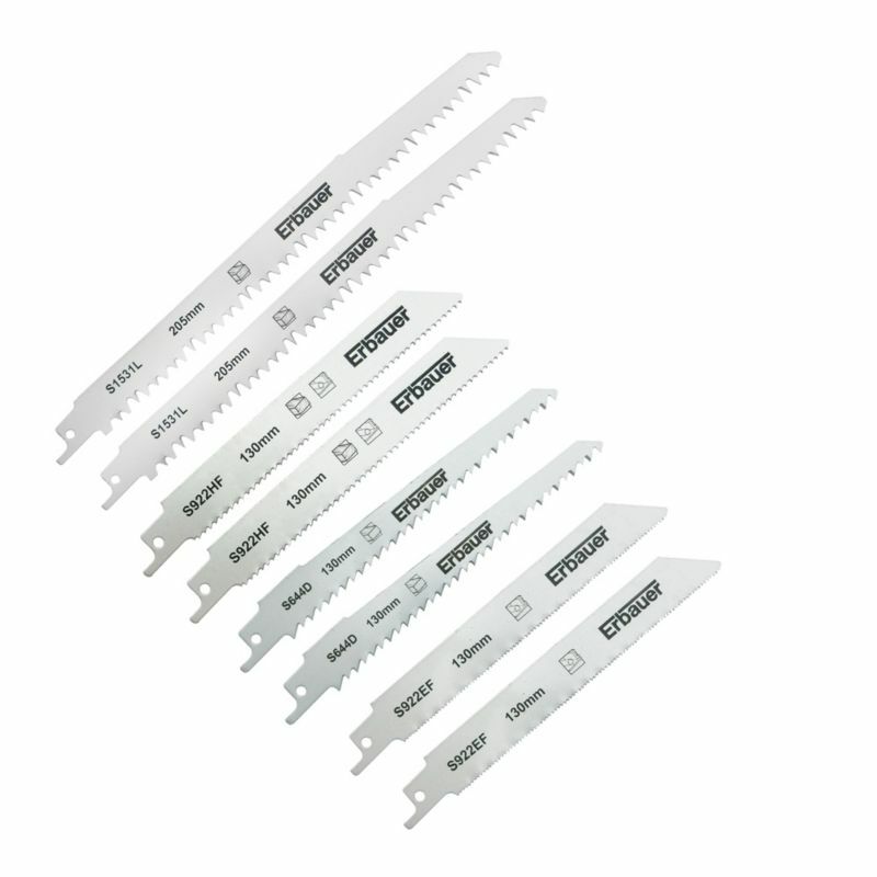 Zestaw brzeszczotów szablastych Erbauer zawiera 8 sztuk wysokiej jakości ostrzy do piły szablastej. Idealnie nadaje się do cięcia różnych materiałów, takich jak drewno, drewno z gwoździami, metal, blacha metalowa, drewno surowe, drewno kominkowe, drewno świeże, gałęzie, rury, profile aluminiowe, drewno i tworzywa sztuczne. Ostrza wykonane zostały z trwałej stali węglowej i bimetalu, co zapewnia wytrzymałość i precyzję cięcia. Dzięki złączu uniwersalnemu można łatwo zamontować je na dowolnym narzędziu piłującym. Niezastąpiony zestaw dla majsterkowiczów i profesjonalistów.
