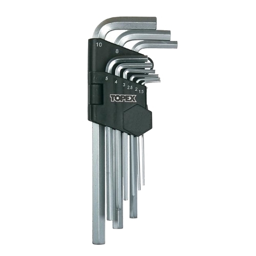 Klucze sześciokątne długie TOPEX (nr ref. 35D956) w rozmiarach 1.5-10 mm. Wykonane z wytrzymałej stali chromowo-wanadowej, zapewniającej długą żywotność produktu. Praktyczne opakowanie z tworzywa sztucznego, z oznaczoną przegródką na każdy klucz, ułatwia ich przechowywanie. Marka TOPEX skierowana jest do majsterkowiczów.