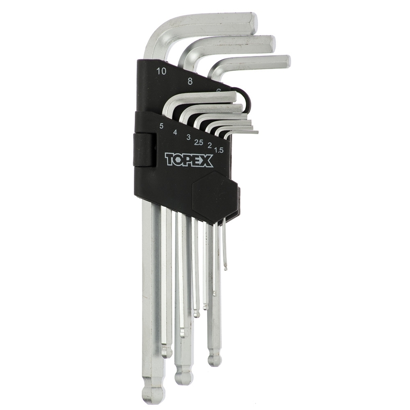 Zestaw kluczy imbusowych Hex 1.5 - 9 mm 35D957 Topex to niezbędny zestaw narzędzi dla każdego majsterkowicza. Każdy klucz w zestawie został starannie wykonany z wysokiej jakości stali, co zapewnia trwałość i wytrzymałość narzędzi. Dzięki różnym rozmiarom kluczy (1.5-10 mm) można wykonywać prace zarówno na mniejszych, jak i większych elementach.