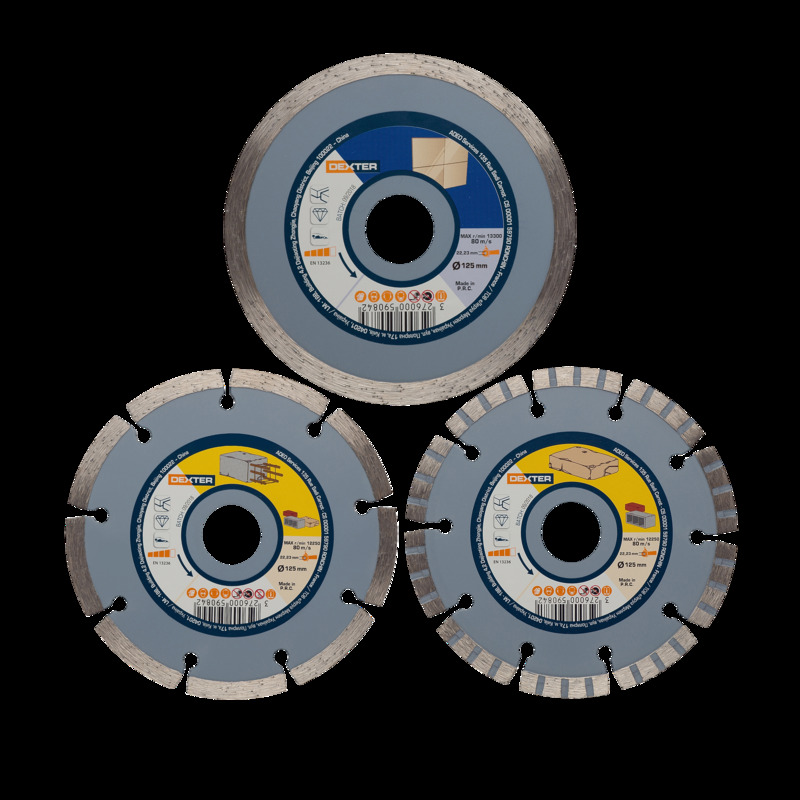 Dzięki możliwości cięcia różnych materiałów i różne typy krawędzi, zestaw tarcz diamentowych DEXTER sprawdzi się w wielu rodzajach prac remontowych i budowlanych.