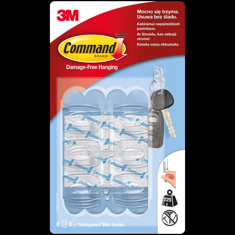 Haczyk samoprzylepny Command udźwig do 0,225 kg transparentny to idealne rozwiązanie do zawieszania lekkich przedmiotów na ścianie bez konieczności używania wiertła czy gwoździ. Dzięki innowacyjnemu systemowi klejenia, łatwo i szybko zamontujesz haczyk na różnego rodzaju powierzchniach, takich jak przezroczyste tworzywa sztuczne, pomalowane ściany, pomalowane drewno, lakierowane drewno, czy szkło. Każdy haczyk ma udźwig do 225 g, co pozwala na zawieszenie niewielkich przedmiotów bez obaw o jego odpadnięcie. W opakowaniu znajdziesz 6 haczyków oraz 8 małych pasków, które ułatwią montaż. Niezawodność marki Command gwarantuje, że Twój przedmiot pozostanie na swoim miejscu przez długi czas.