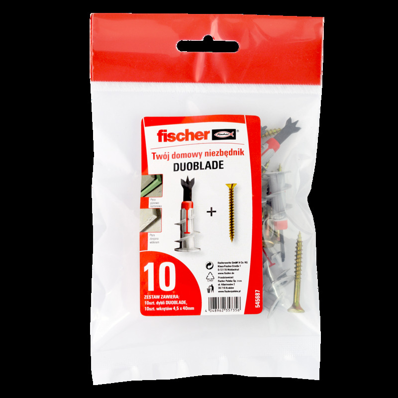 Fischer Kołek do płyt GK DUOBLADE to innowacyjne rozwiązanie dla Twojego domu. W zestawie znajdziesz aż 10 sztuk, które pozwolą Ci na montaż płyt gipsowo-kartonowych w sposób szybki i bezpieczny. Dzięki zastosowaniu dwóch ostrzy tnących kołek posiada doskonałą przyczepność do ściany, a jego prosta konstrukcja zapewnia łatwy i szybki montaż. Zapewniamy, że kołki Fischer to doskonały wybór do Twojego projektu remontu lub budowy.